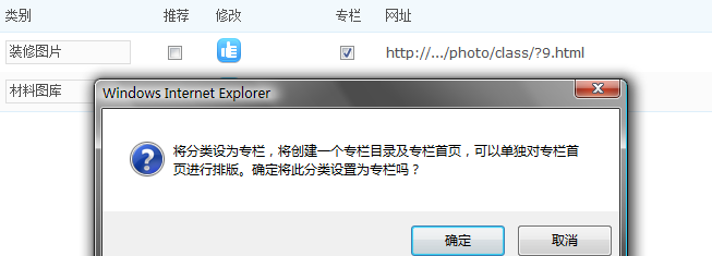 在图片分类管理列表中,钩选“专栏”,自动将分类专变为专栏,可进行专栏主页排版