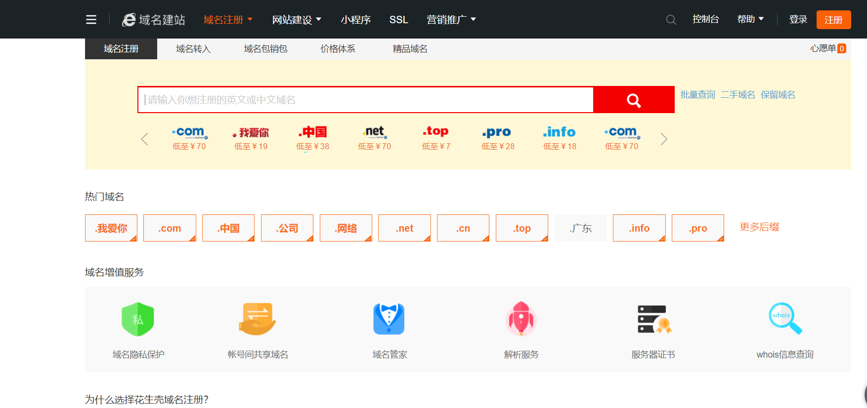 第一步,打开【域名服务】页面:http://domain.oray.com /,输入您要注册的域名,选择后缀,点击“查询”。