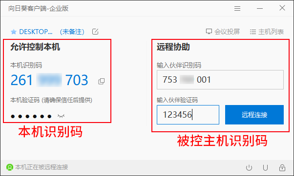 向日葵识别码,用于控制端对本机进行远程控制时的数字码凭证,时系统自动分配的随机码。发送“本机识别码”给控制端,控制端便能通过识别码对本机进行快速远程访问。