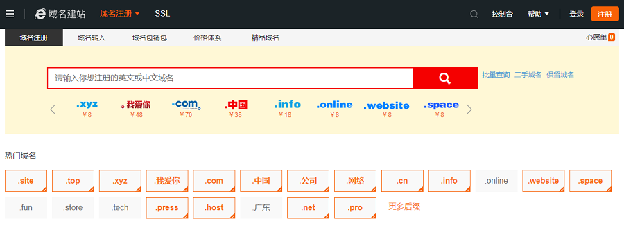 1、进入贝锐官网,点击【域名建站】——【域名注册】,在域名注册下面的文本框输入要注册的域名的前缀,在“热门域名”选择后缀,点击文本框后面的"查询",只要域名未被注册,在查询结果对应域名后面都会有一个“立即注册”的按钮。