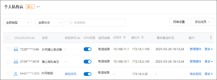 ②手机登录贝锐蒲公英客户端后,点击设备列表的组网管理,可将未加入组网的设备快速添加至默认的异地组网中。点击【组网管理】->【编辑】,勾选未授权的设备,勾选后点击【完成】,设备已加入至组网中。