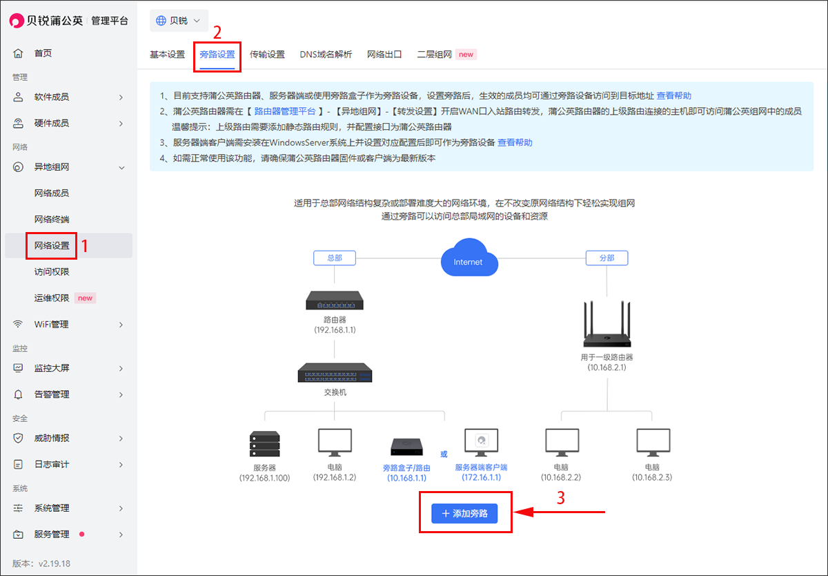 进入蒲公英控制台https://p.oray.com ,在【异地组网】->【网络设置】->【旁路设置】,点击添加旁路,允许生效对象可以访问与X1同网段的设备。