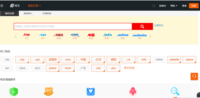 1、进入Oray官网,点击【域名】——【域名注册】,在域名注册下面的文本框输入要注册的域名的前缀,在“热门域名”选择后缀,点击文本框后面的"查询",只要域名未被注册,在查询结果对应域名后面都会有一个“立即注册”的按钮。