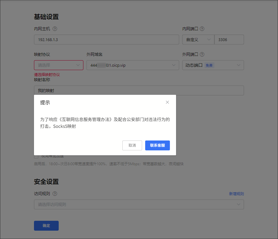 | 夜间带宽 | 每天18:00-次日8:00,所有映射带宽提升100%,且速度不低于5Mbps |