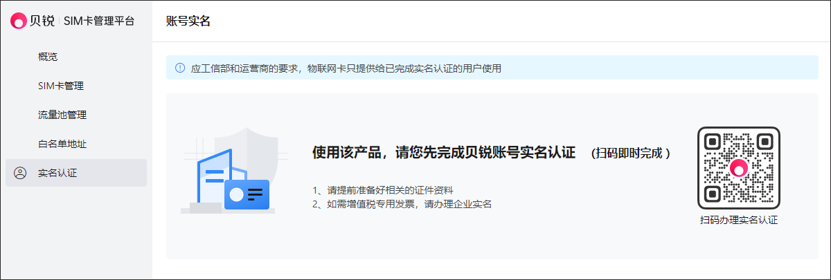 点击左侧导航栏【实名认证】,进入SIM卡管理界面;使用手机浏览器扫描页面二维码,登录贝锐账号密码,完成在贝锐实名认证步骤。