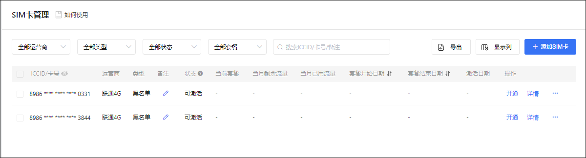成功添加SIM卡,根据不同状态可进行开通、查看流量和换绑操作。