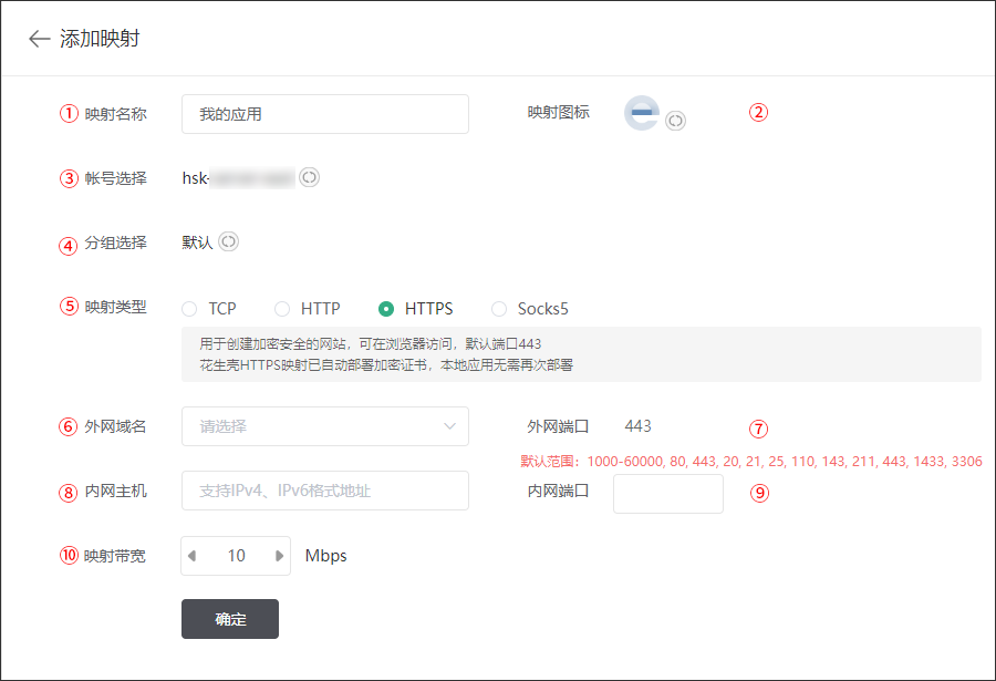 ⑦外网端口:根据服务类型选择(默认范围:1000-60000, 80, 443, 20,21, 25, 80, 110,143, 211,1433, 3306)。管理员账号与授权账号共享使用服务器端口号,服务器端口号只能被一条映射占用,80、443除外。