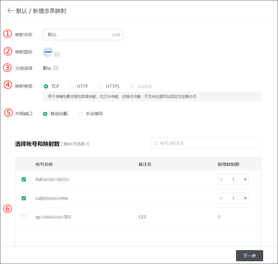 ⑥选择账号和映射数:选择需要创建映射的授权账号,并且可以选择新增的条数,目前仅支持同时新增10条映射。