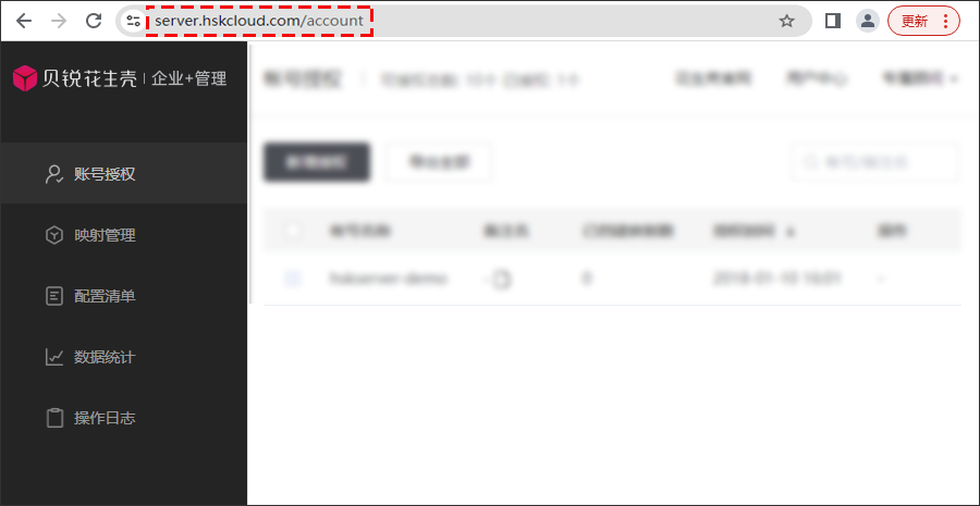 创建成功后,通过访问域名即可登录花生壳企业+管理平台。花生壳企业+管理平台为管理员提供了账号授权、映射管理、配置清单、数据统计和操作日志五大功能模块。
