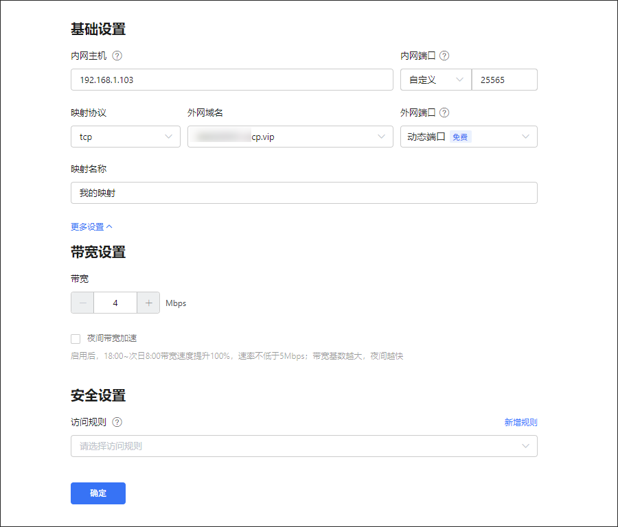 | ⑤ | 外网端口 | 根据服务类型选择(固定端口:需购买、删除映射后可重复使;动态端口:免费系统随机分配) |