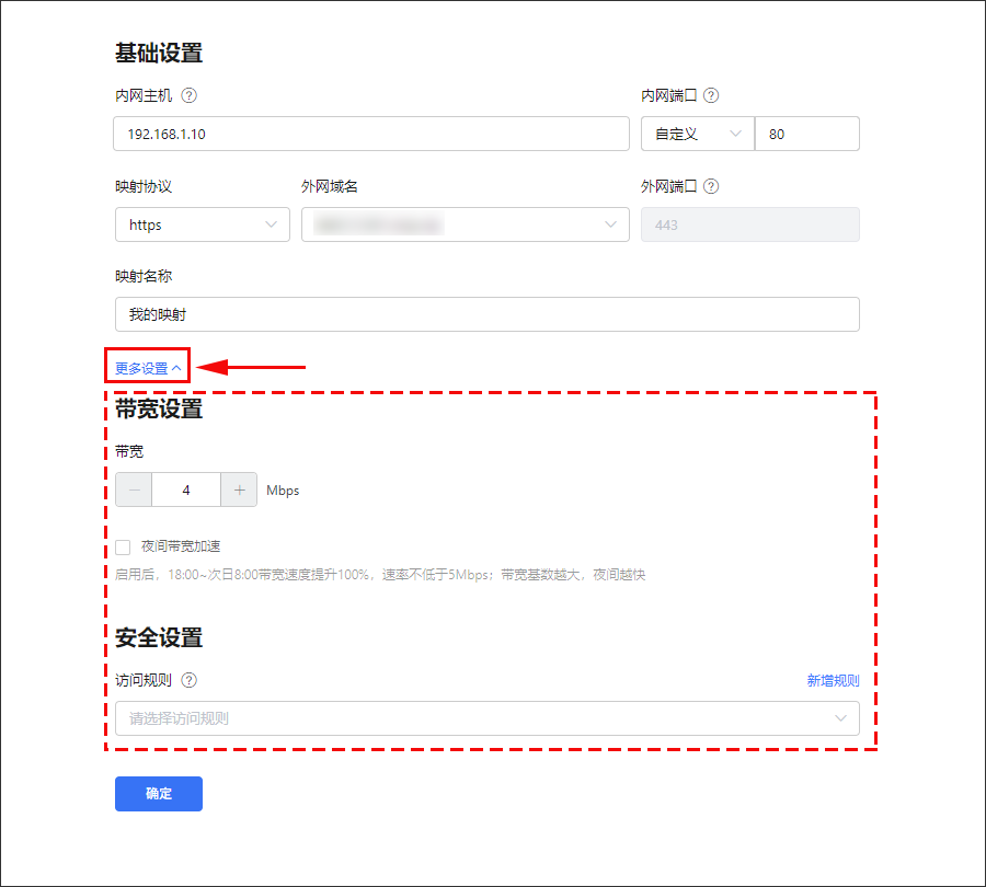 若有带宽或安全需求,可点击【更多设置】进行相关设置。
