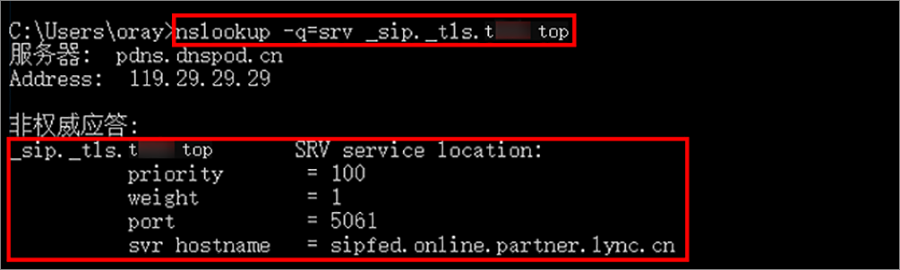 (2)输入命令" nslookup -q=srv _sip._tls.xxx.top ",查看返回的结果与设置的是否一致即可。