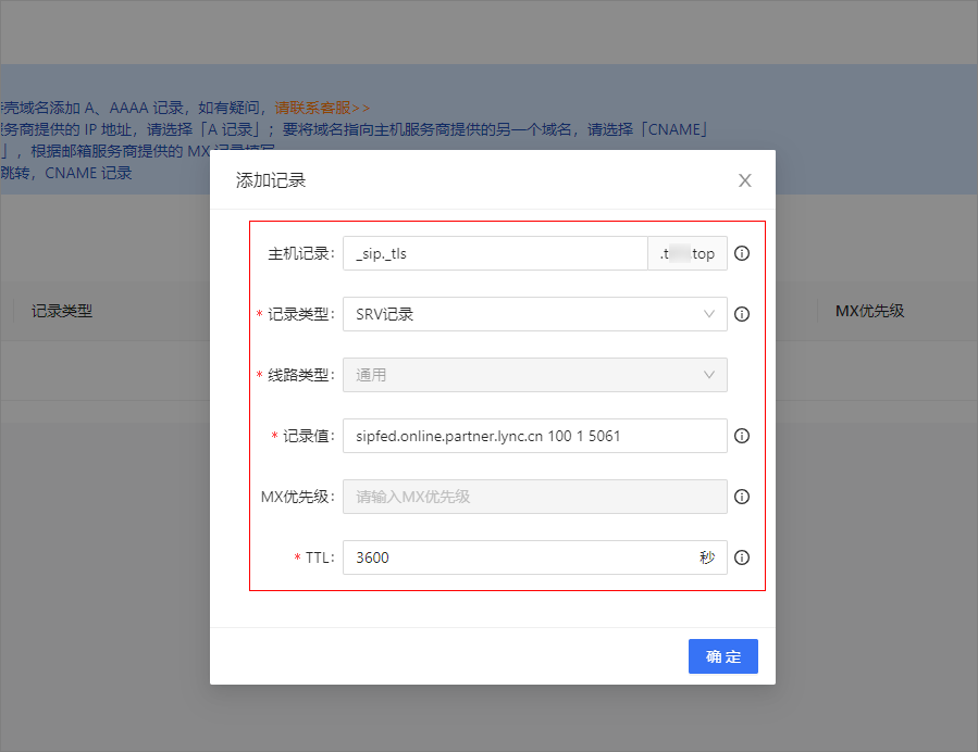 记录值 | 格式为 主机名 优先级 权重 端口,每项中间需以空格分隔。 例如:sipserver.example.com 0 5 5060 |