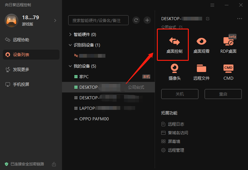如果提前在公司电脑安装了向日葵远程控制软件,并在自己准备带回老家的笔记本和自己的手机上也安装好向日葵,并且登录同一个账号,将被控端的设备绑定,这样一来我们就能在【我的设备】一栏找到对应的电脑,点击【桌面控制】就能发起远程控制,处理工作需求了。