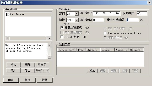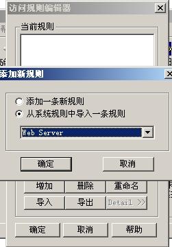 打开Sygate 管理器选择[工具]--[访问规则]--[添加]--[从系统规则中导入一条规则]--[web servers]确定弹出访问规则详细配置文件。