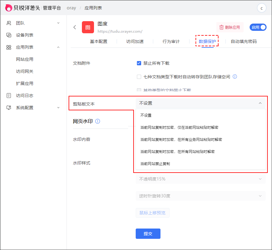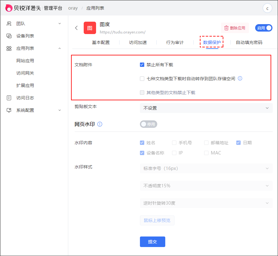 管理员可以对网站应用设置网页水印,支持配置水印内容为姓名、手机号、邮箱地址、日期、设备名称、IP、MAC。并支持配置水印样式,具体支持配置水印文字字号、不透明度、水印旋转角度。