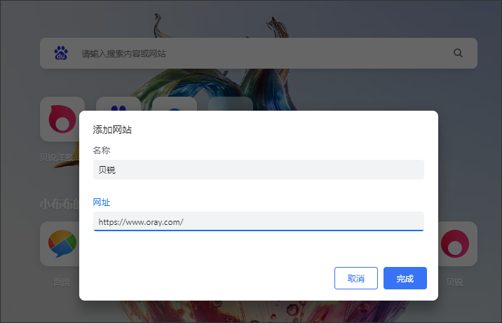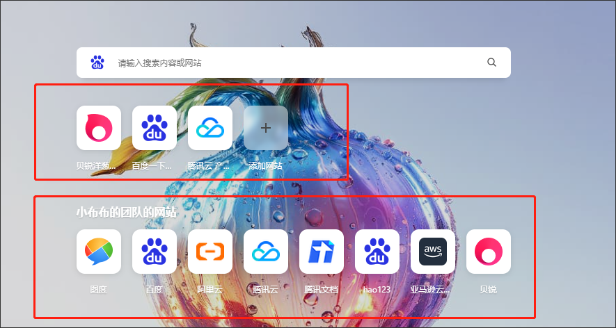 上方区域由用户管理,默认展示浏览器最近访问的网页。用户也可以在此区域添加自己的快捷应用,或移除、修改应用。