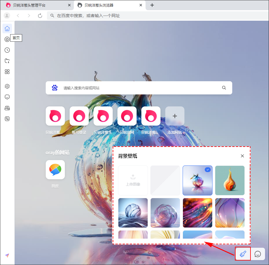 页面右下角支持设置首页的背景壁纸,壁纸支持切换系统提供的壁纸,也可以选择从本地上传图像。