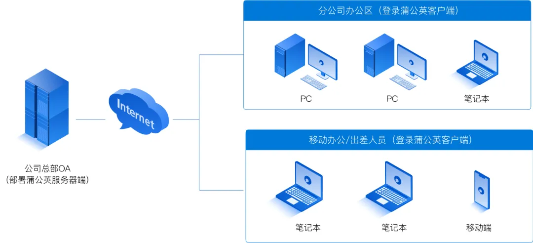 在方案部署方面,蒲公英智能组网作为一款即装即用的异地组网方案,无需公网IP,也不用改变企业原有的网络结构,只需要在蒲公英云端网络管理平台进行简单设置,在通源石油企业内部资源服务器上部署贝锐蒲公英服务器端,员工各端安装贝锐蒲公英访问端客户端,无需技术人员也能快速部署、组建异地虚拟局域网,实现异地分支机构、远程办公人员对总部OA系统互联互访。