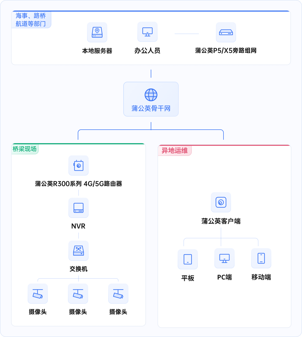 其次,海事、路桥、航道等部门办公室,在无需调整网络架构的情况下,旁路部署蒲公英企业级路由器P5或X5,通过快速、简单的云端设置与桥梁现场的工业级路由器R300系列组建成同一虚拟局域网,从而实现远程数据实时互通,集中远程监看。