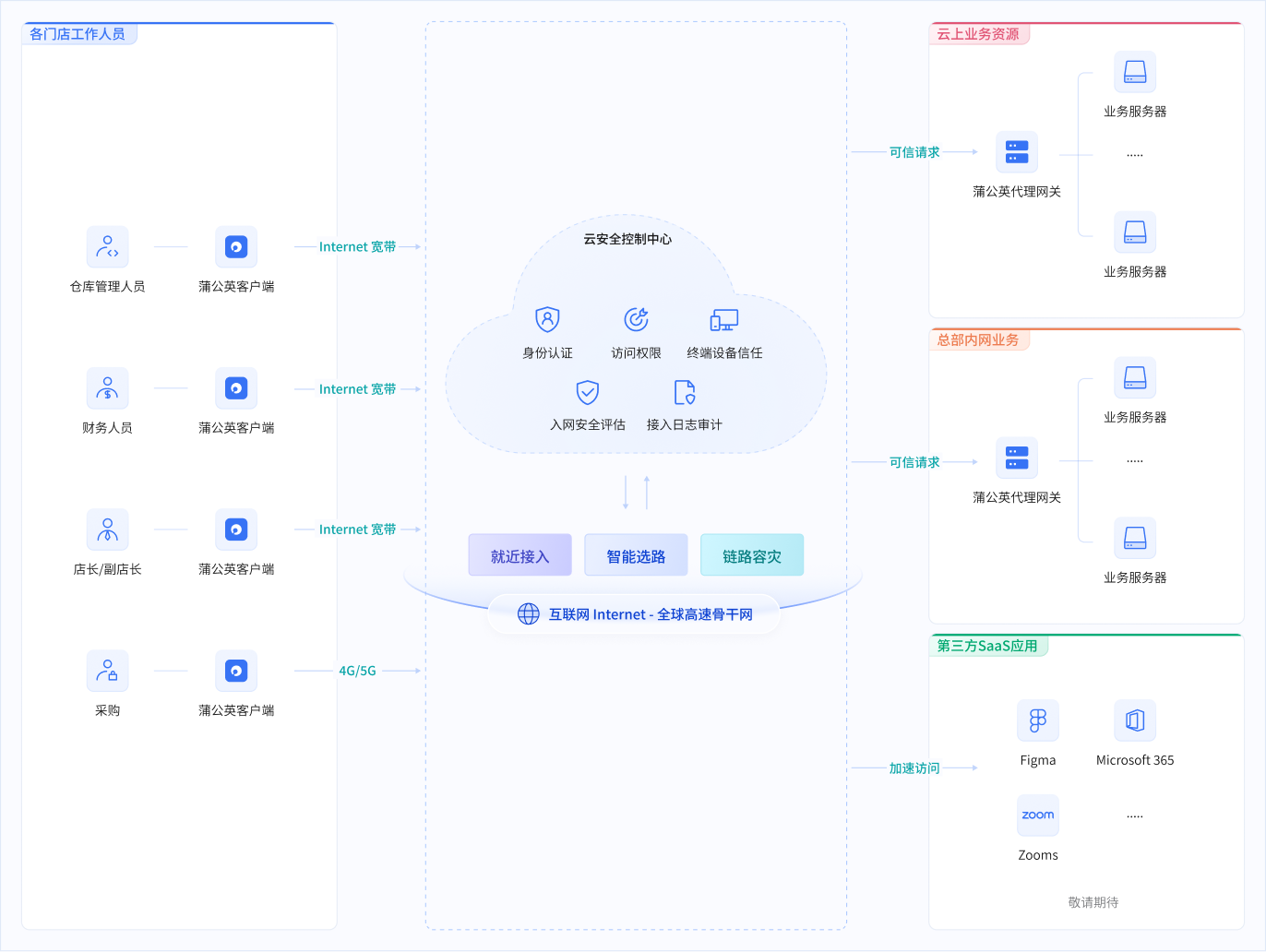 智能选路,提升各地门店访问体验:蒲公英具备智能选路能力,自动选择最佳线路,可以在远距离、跨地域、跨运营商场景下实现延迟更低、速度更快业务系统访问体验。