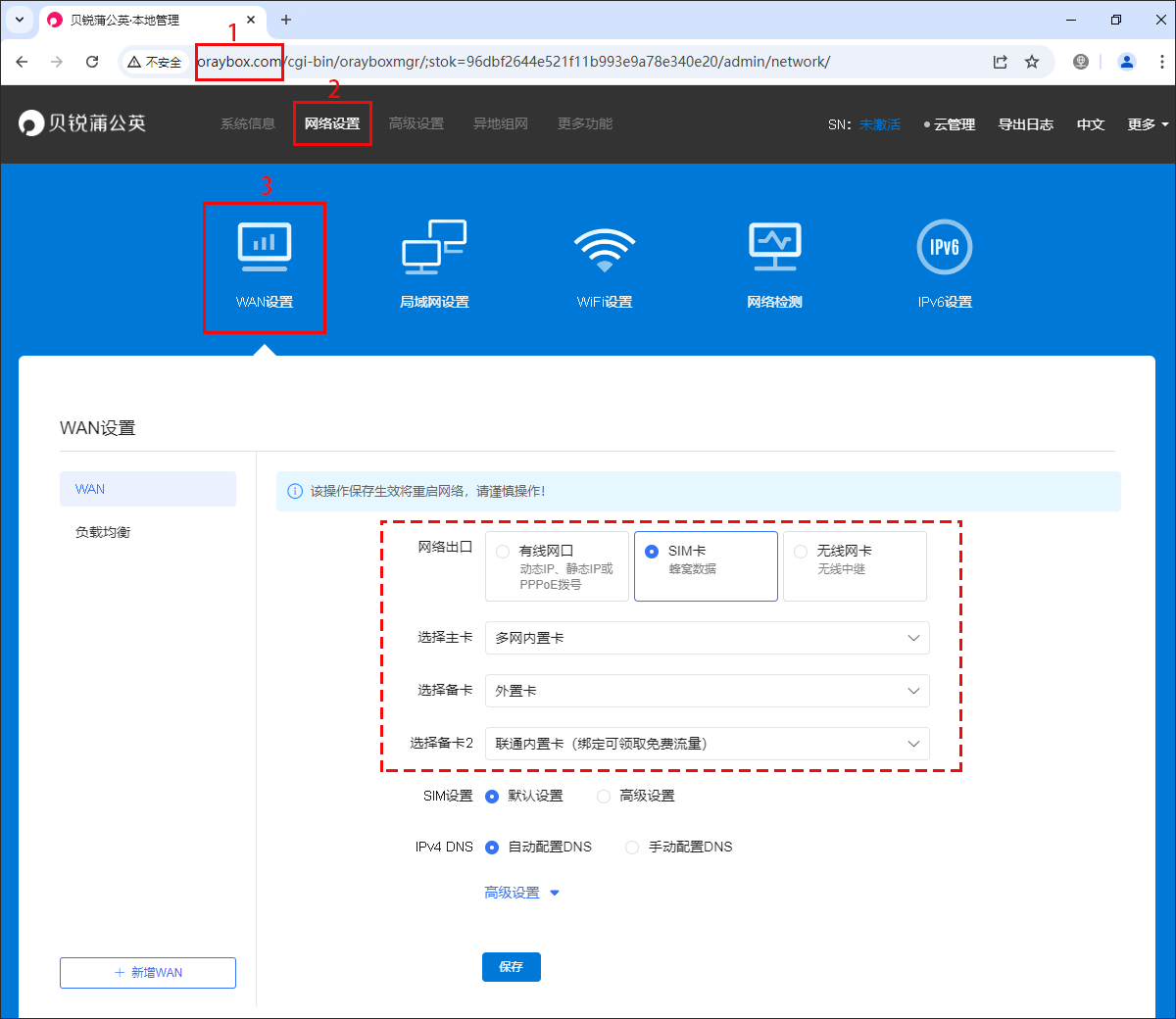 蒲公英路由器切换上网方式为SIM卡上网,移动终端可通过网线或路由器WiFi连接路由器后,浏览器输入http://oraybox.com,点击【网络设置】->【WAN设置】,更换网络出口上网方式为SIM卡以及选择上网的主卡和备卡。