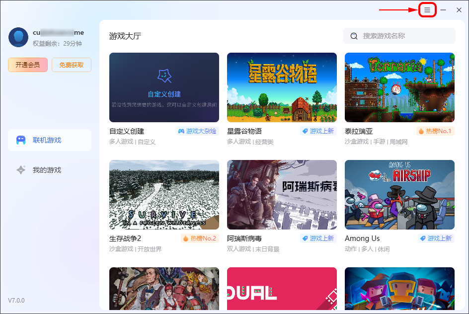 首页右上角显示当前登录的账号信息。未开通联机会员的账号显示当前游戏联机权益剩余时长;点击【免费获取】,可使用微信扫码关注微信小程序做任务获取及累积游戏联机权益时长;也可以点击【开通会员】,快速畅享游戏联机服务。