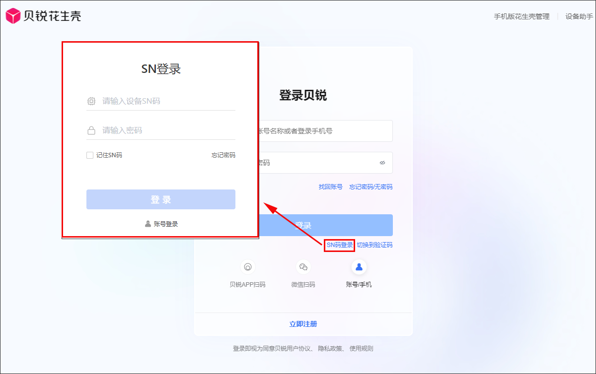 注意:激活成功后,下次通过SN码登录时,应当输入贝锐账号密码;也可在“设备管理”中修改登录密码