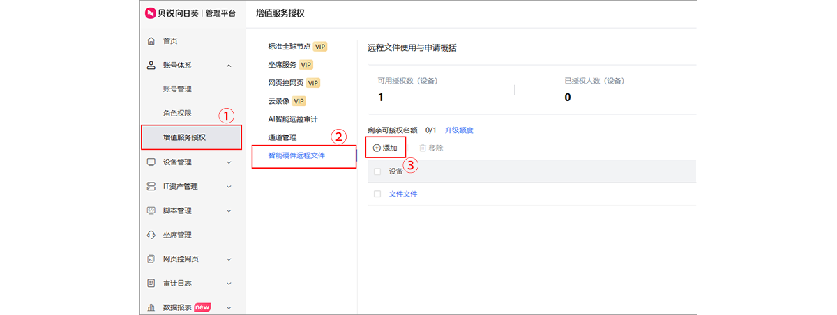(1)登录向日葵管理平台,进入【增值服务】界面选择“智能硬件远程文件”功能;
