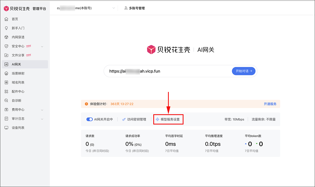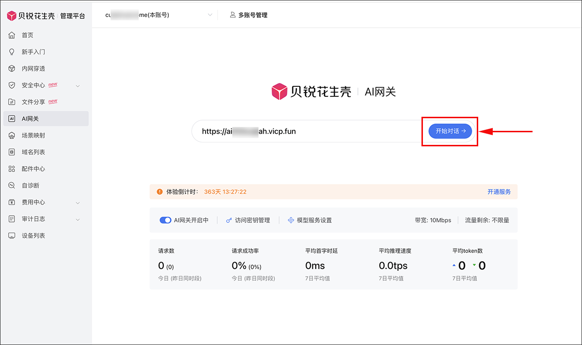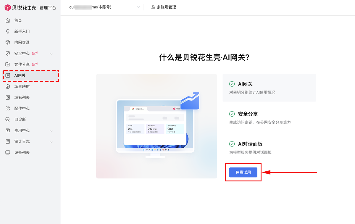 (2)在花生壳控制台中,点击“免费试用”【AI网关】功能。