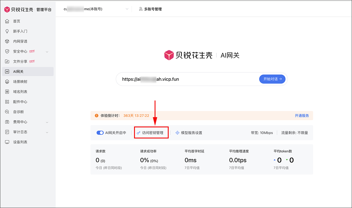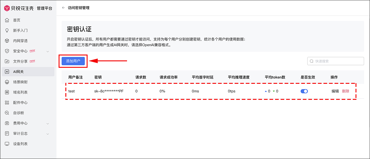 (1)点击AI网关的【访问密钥管理】,添加可登录花生壳AI网关的用户。