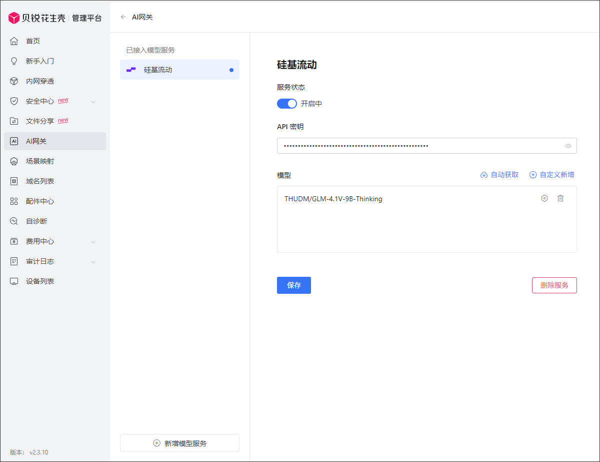 点击AI网关的【模型服务设置】,引导步骤中未设置模型服务可在此进行设置;若已设置模型服务,可在此修改模型服务的内容。