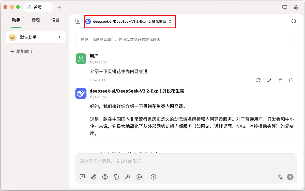 (2)在Cherry Studio的对话窗口中,可选择花生壳AI网关接入的AI模型进行对话。