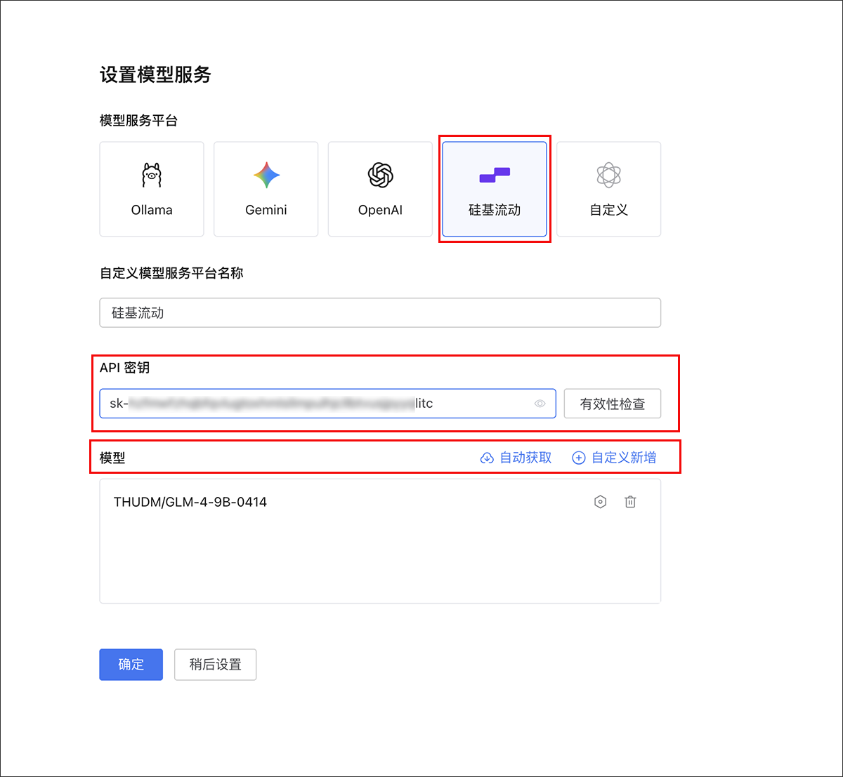 模型 | 在硅基流动的模型广场中选择适用且可使用的模型(可加载所有模型或自定义添加个别模型) |