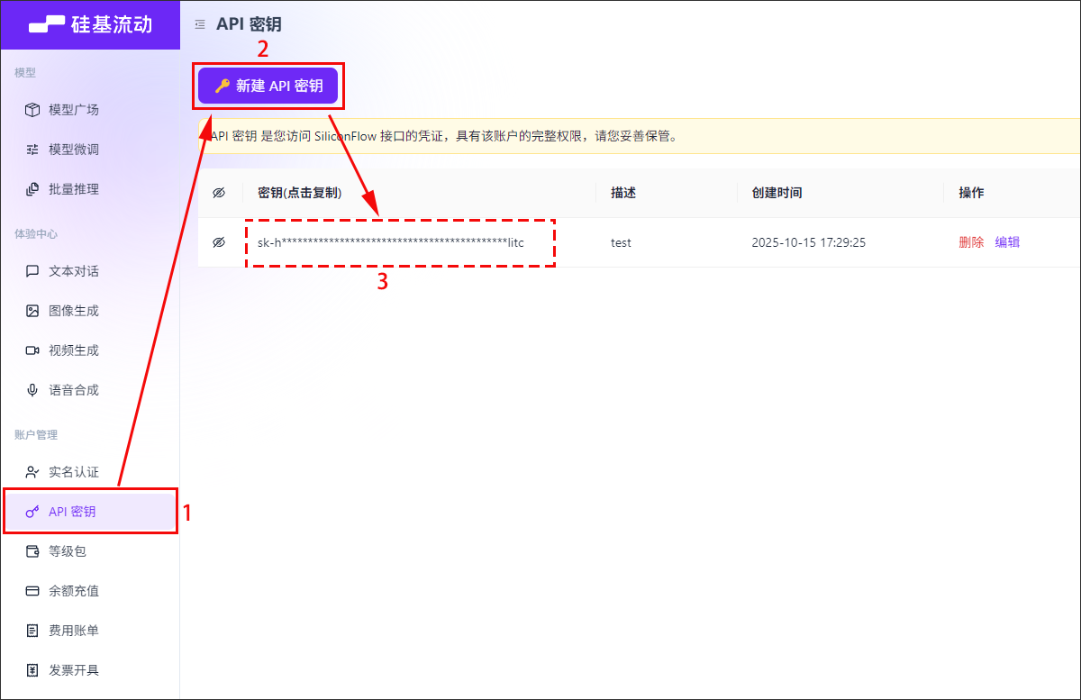 (1)在硅基流动模型服务平台中,新建API密钥。