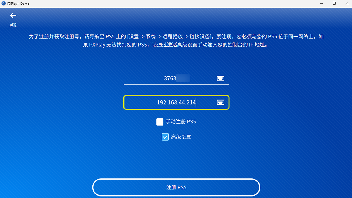 (5)PXPlay软件客户端中绑定PS5,并测试能否本地串流。注册新PS>P-Station5>输入“注册编号"、点击高级设置填入 PS5的局域网IP地址