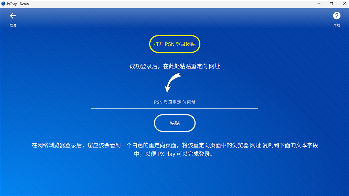 (6)根据PXPlay界面提示完成绑定,推荐选择通过PSN登录方式注册