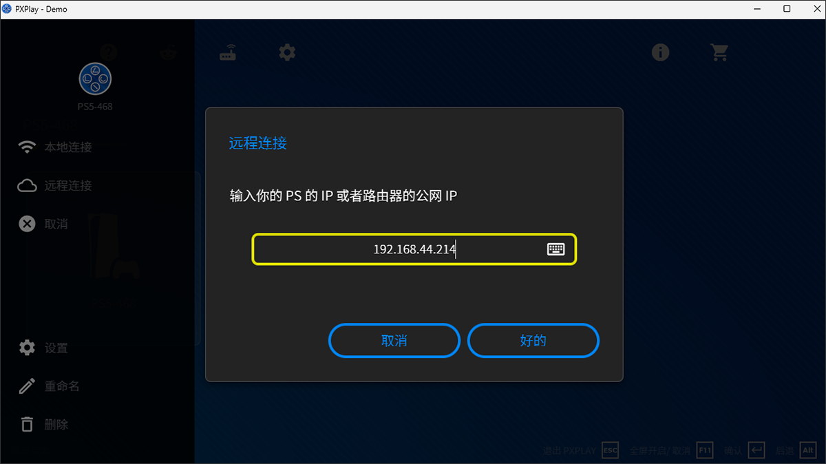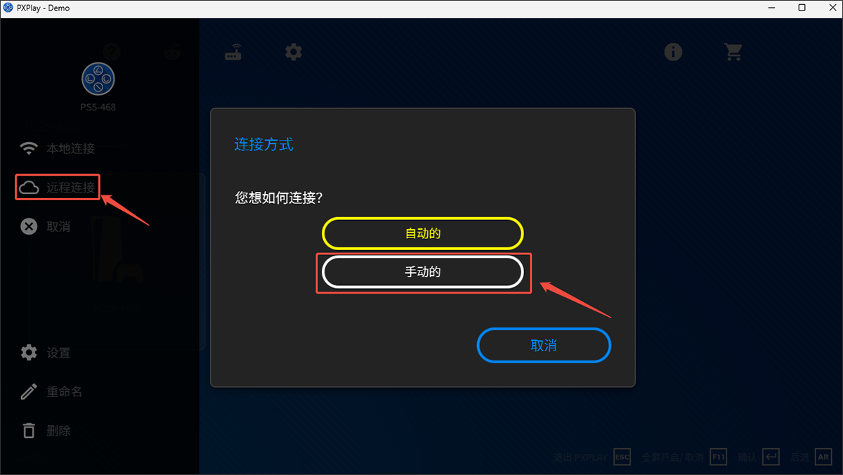 (8)PXPlay软件客户端中,点击刚才绑定的PS5,菜单中点击远程连接,选择手动,输入PS5的局域网IP地址,之后即可进行远程串流。