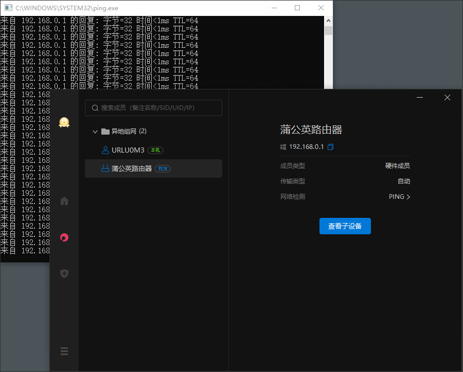 (1)完成X1 Pro设备初始化后,以电脑设备为例,电脑设备下载安装贝锐蒲公英客户端并使用与绑定X1 Pro相同的贝锐账号进行登录。登录后,点击“网络图标”,选中对应成员,点击网络测试的“PING”即可进行PING测试,若有收到回复,则表示组网通道已建立。