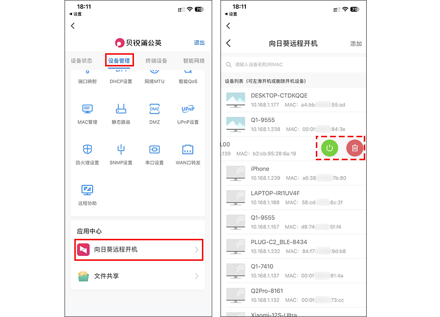 (2)进入管理页面后,下滑到底部,选择向日葵远程开机;进入开机界面后,选择开机设备左滑,点击远程开机。