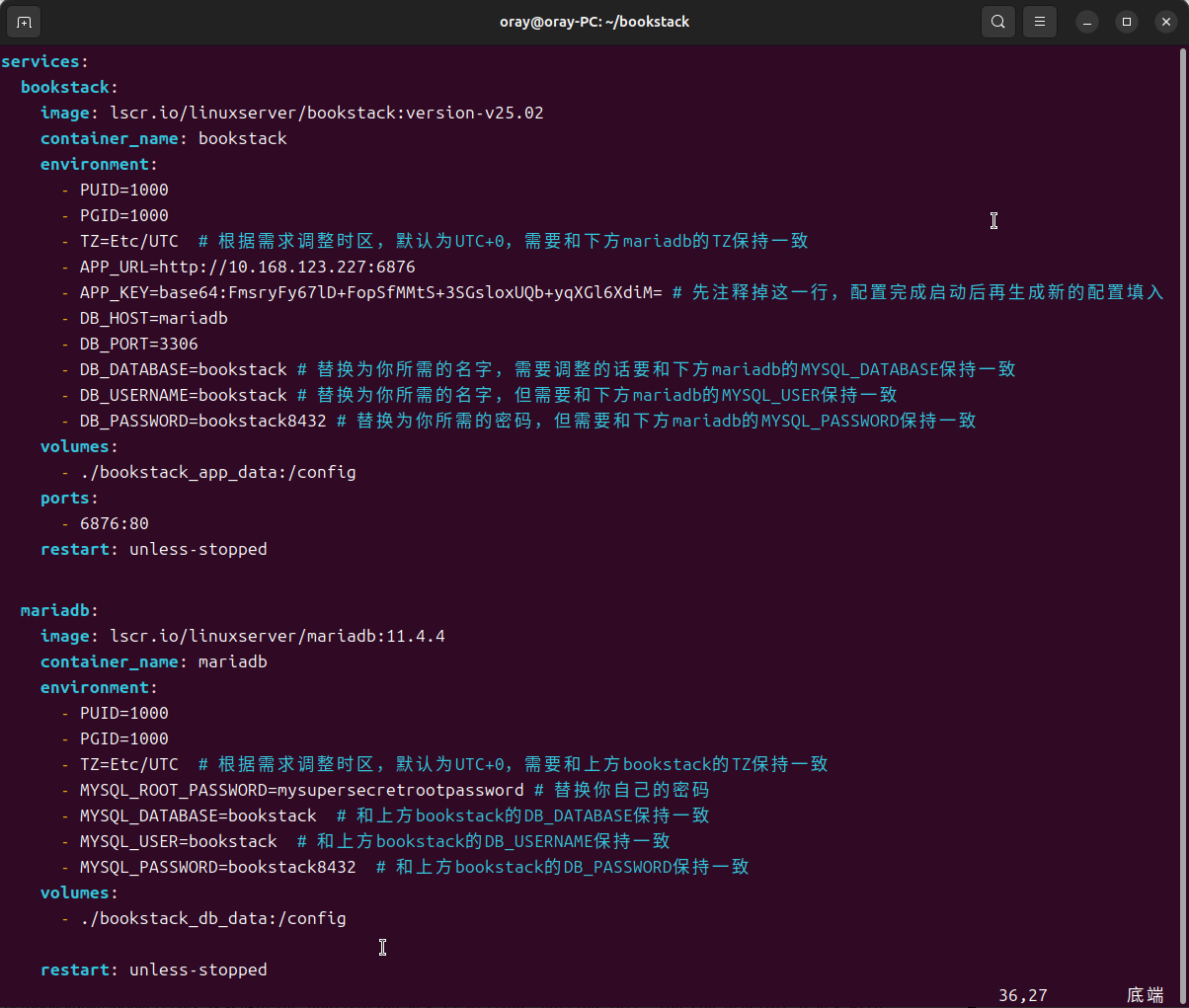 - DB_USERNAME=bookstack # 替换为你所需的名字,但需要和下方mariadb的MYSQL_USER保持一致