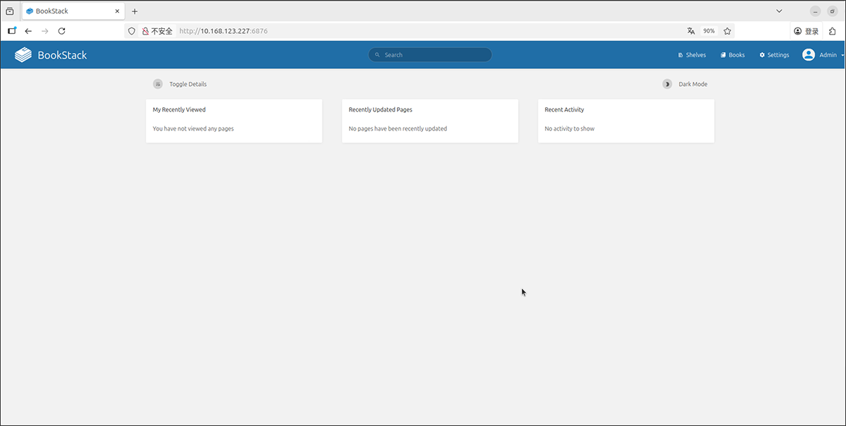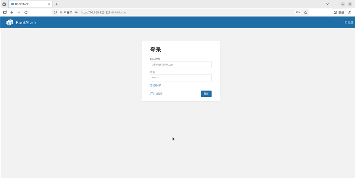 (4)运行完成后,在浏览器输入 http://本地IP:6876 (本例http://10.168.123.227:6876) ,即可web访问个人知识库BookStack。