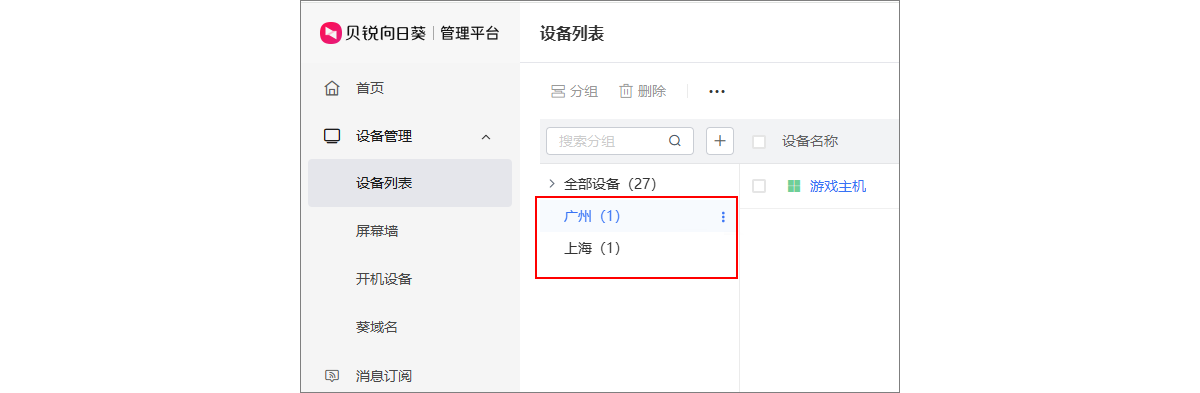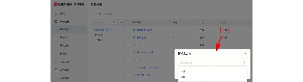 1)在右侧设备列表中,找到目标设备,鼠标移入“分组”列;