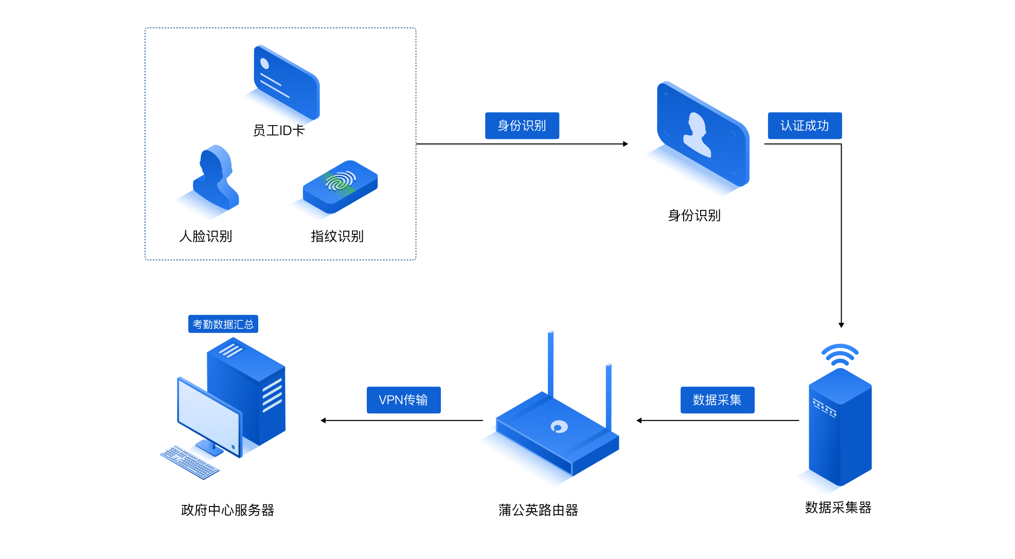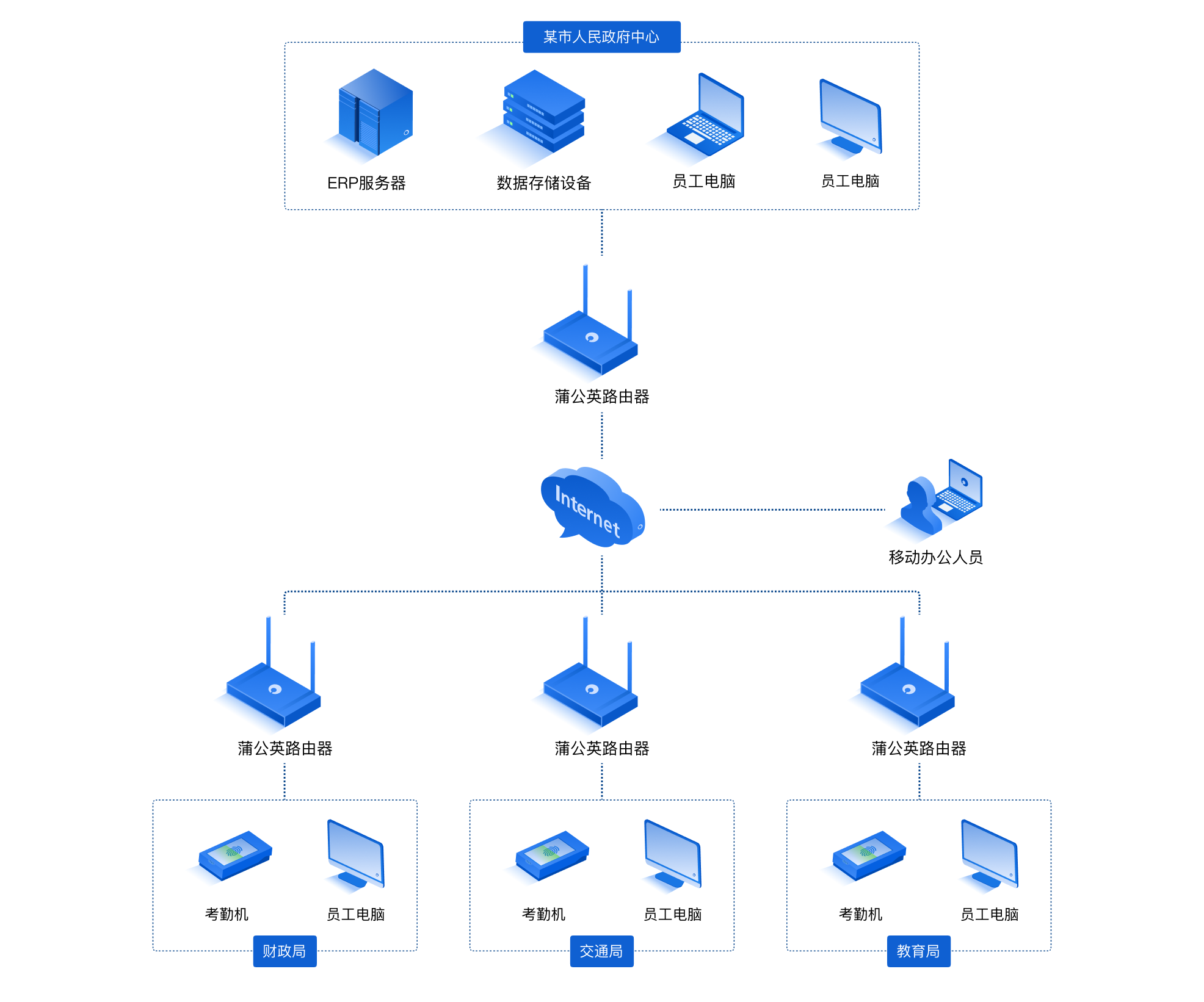 通过分布在每个区域的机关单位各自部署一台蒲公英路由器X3,将考勤设备连接到蒲公英路由器X3进行联网使用。