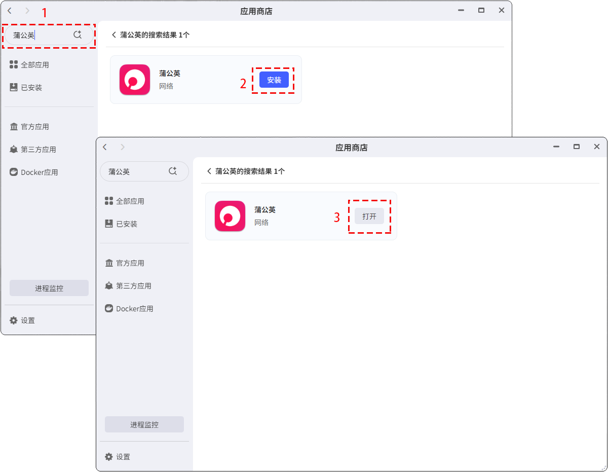 (1)在应用商店搜索「**蒲公英**」并安装应用。