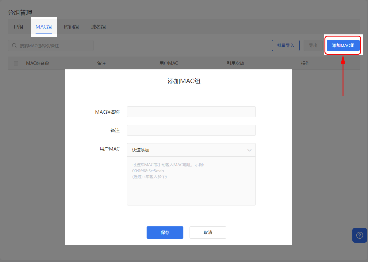 创建MAC组,并可添加当前设备下接的终端MC地址或手动输入MAC地址。