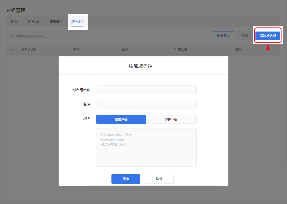 创建域名组并输入域名,可输入具体域名或泛域名。