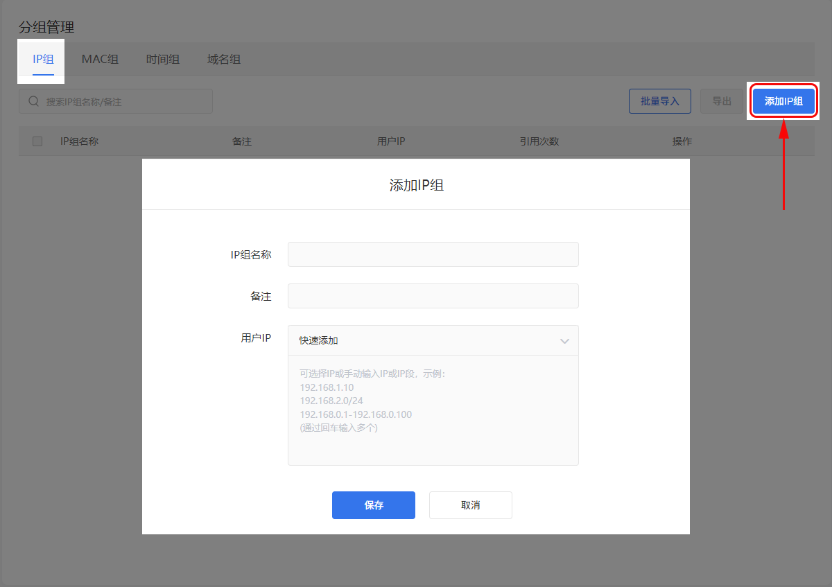 创建用户组并添加用户IP或IP段。