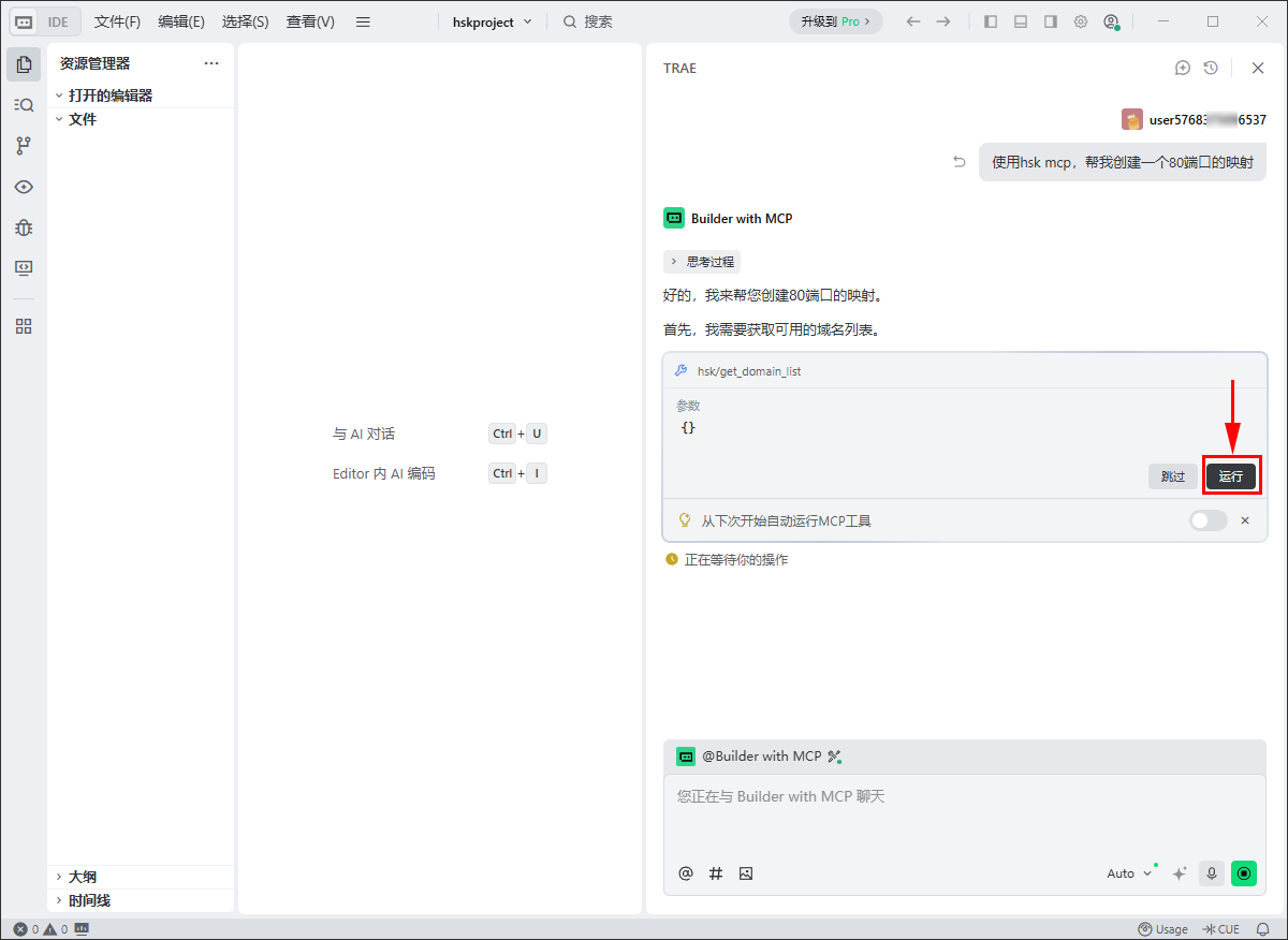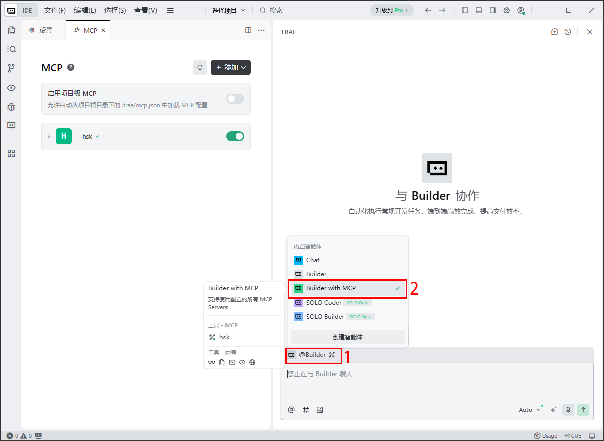 (4)花生壳MCP配置完成后,在AI聊天窗口替换智能体为“Builder winth MCP”。