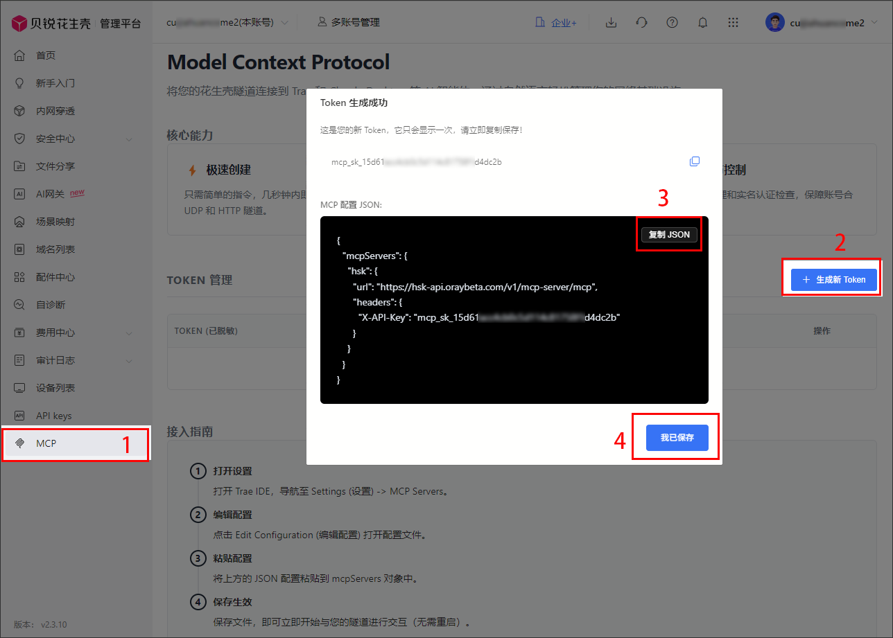 (1)在花生壳管理平台,点击【MCP】->【生成新Token】->【复制含Token的MCP配置JSON】,用于后续创建花生壳MCP。